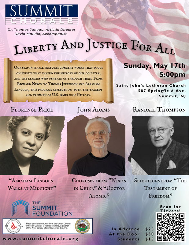 The Summit Chorale’s season finale features concert works that focus on events that shaped the history of our country, and the leaders who ushered us through them. From Richard Nixon to Thomas Jefferson and Abraham Lincoln, this program reflects on both the tragedy and triumph of U.S. American History. The concert includes movements from Randall Thompson’s The Testament of Freedom, which uses texts from the Declaration of Independence, Florence Price’s Abraham Lincoln Walks at Midnight, and selections from John Adams’ operas Doctor Atomic and Nixon in China.